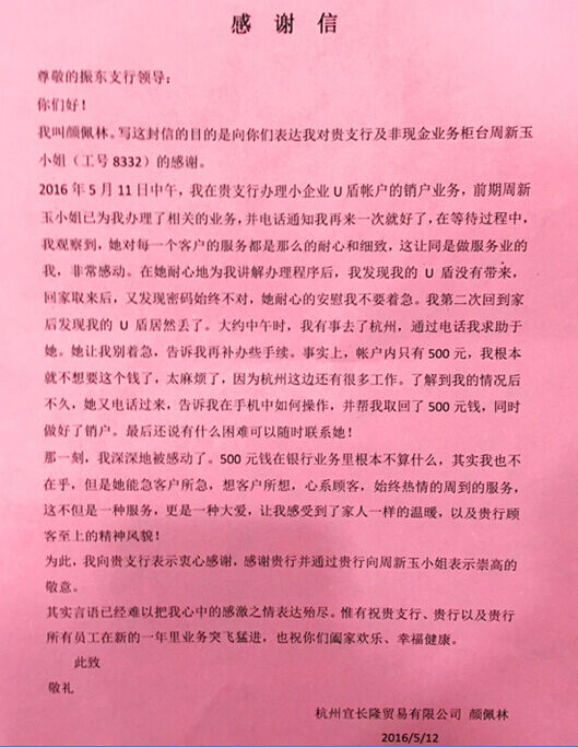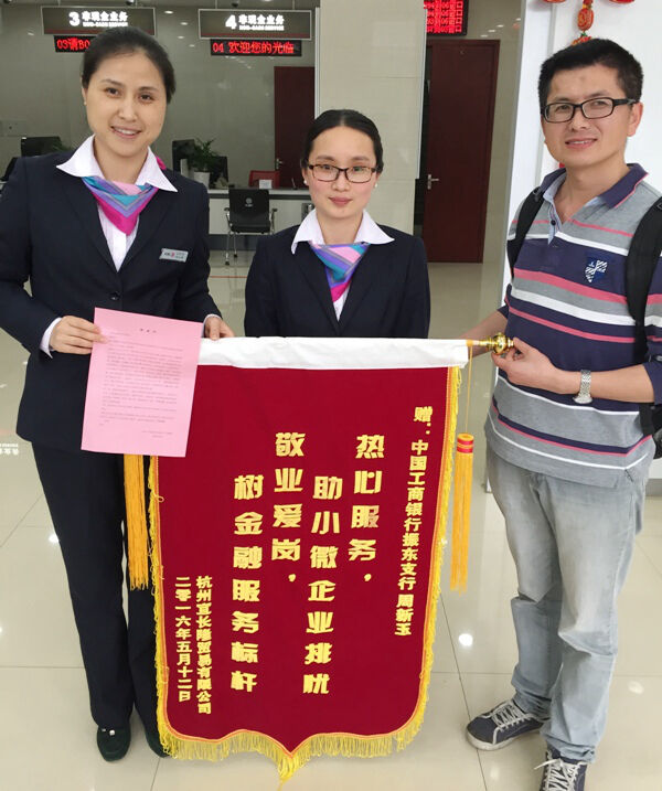 2016年5月12日中午,桐乡振兴支行1号柜台员工周新玉正在熟练地为客户办理账户变更业务,微笑始终挂在她的脸庞。这时,网点负责人葛行长招呼她:“小周,空了请出来一下,有位客户给你送锦旗来啦!”“送锦旗?给我?有人给我送锦旗?”小周一时摸不着头脑,想不出原委。抬头一看,原来是就是昨天来办理对公销户业务的颜先生夫妇。他俩手捧着锦旗耐心地在后面等待,说“我要来感谢小周,感谢工行!”这时,小周微笑的脸庞更增添了红晕。因为在她看来,自己只是做好了本职工作,却受到了客户如此的褒奖和感激。
