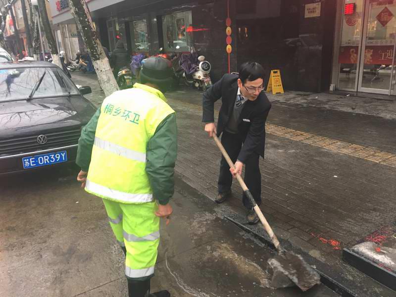 李师傅是桐乡环卫的一名普通环卫工人,负责桐乡市梧桐街道鱼行街附近的路面清扫维护工作,接连几日下雨,这周六桐乡梧桐支行今天一开门,客户有增无减。这时,梧桐支行的老王看到了正在门口不远处清除积水的李师傅,在这样的天气里,李师傅鼻头已被冻红。