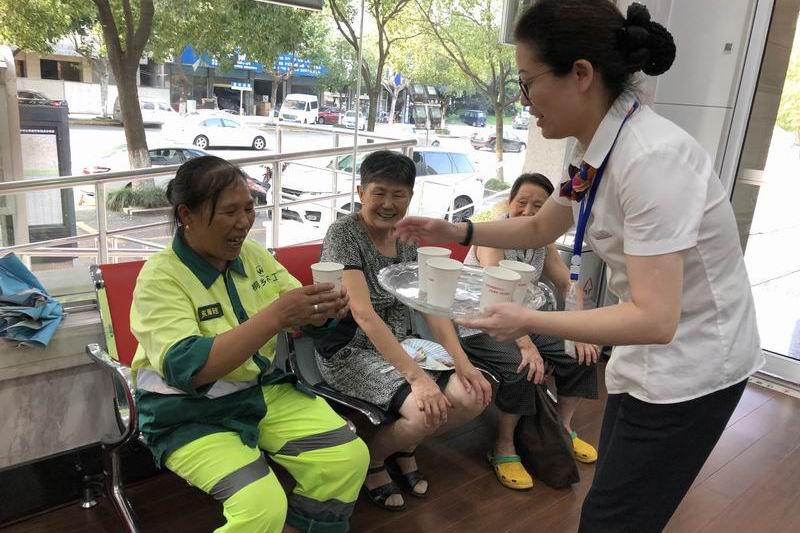 2019年7月29日,工行桐乡支行营业部大堂经理为在网点避暑的环卫工人递上一杯解渴的水,送上一份工行人的爱心。