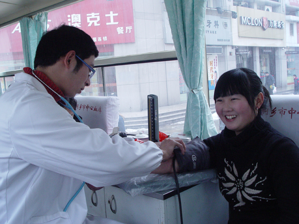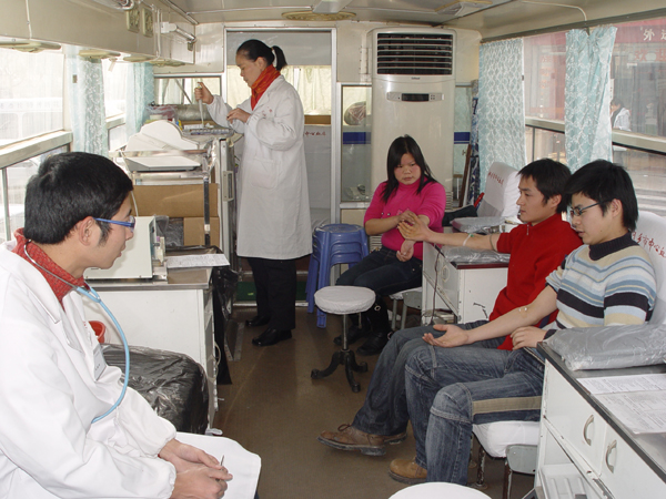 采血车上负责检测血液的姚晴主任看到一下子来了5位要求献血的人,马上打电话求援来人帮忙。她趁志愿者填写表格的片刻对记者说,进入冬季以来,市中心血库血液供应明显紧张,主要原因是血源减少。今年受大雪灾害天气影响,桐乡街头流动献血人数减少,同时医院春节前择期手术的增加和恶劣气候导致外伤人员剧增,各医院用血量剧增。当笔者问一位贵州来桐乡打工的小伙子时他十分感慨。他说,在桐乡打工好几年,一次他母亲来桐乡看望他时得了一场大病,急需输血,但当时血源紧张,多亏桐乡的好心人献血,救了他母亲的命。这次正好放假休息就来献血,一为报答桐乡恩情,也为献血出一份力。