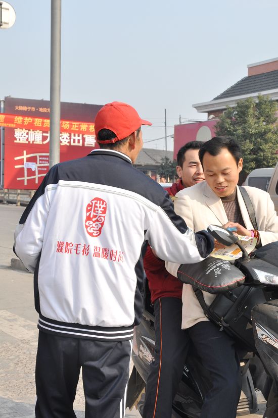 老人身着印有“濮院毛衫,温暖时尚”的运动服向过往行人散发宣传资料