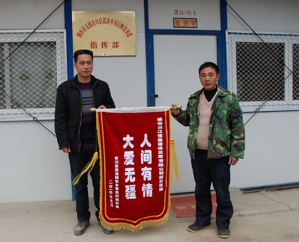 今年1月22日,两面分别书写“大爱无疆,人间有情”、“震后伸援手,爱心济危弱”锦旗送到了浙江恒基建设,董事长吕德坤表示今后将继续关注灾区,在恒基今后的发展中,将一如既往地致力于公益事业,向社会传达恒基人的拳拳爱心,用恒基精神不断地创造感动。