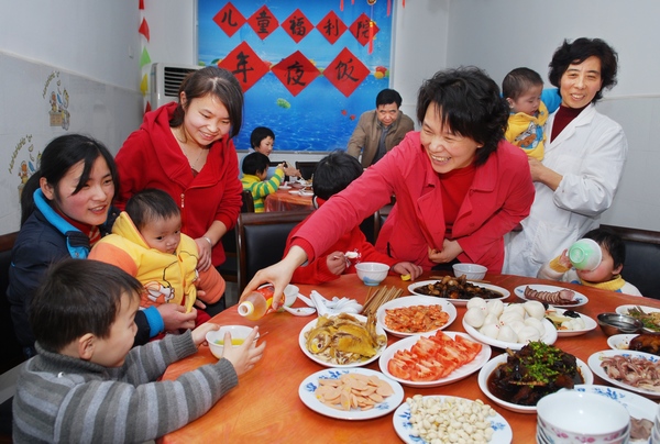 图为市儿童福利院的孤儿们吃着温馨年夜饭。