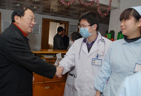 2月12日,农历十二月廿九。市第一人民医院的医护人员与往常一样,忙碌在各个岗位上。费建文在市委办负责人的陪同下,一早来到医院,向医护人员拜年。“新年好!”费建文先后来到急诊室、二病区、五病区,亲切地与医护人员握手,并关切地询问病区春节期间值班人员安排情况。