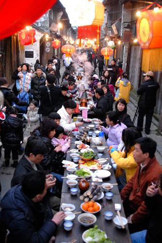 春节期间,连续5天的“春节长街宴”在乌镇西栅老街上举办,一个连绵数百米、数以千计的游客聚在一起用餐的长街大宴席,宛如一道别有情趣的风景。摄 陆晓春