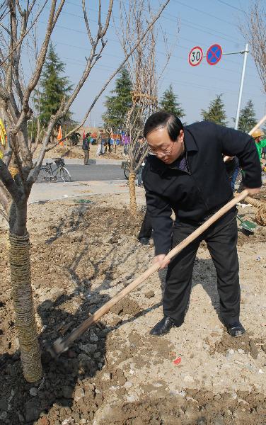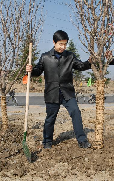 2月20日下午2时,市四套班子领导统一乘车到达庆丰北路延伸段与秋实路交叉口。“好,开工!”打头阵的是市委书记费建文,他拿了一把铁钯走到一棵准备好的日本晚樱树跟前,开始挥动铁钯。费建文与市委常委、统战部长沈济贤一起,很快挖了一个与树的根球大小相当的坑。两人小心翼翼地把树放入坑中,扶正,边往坑里加土,边留心察看树体有无倾斜。