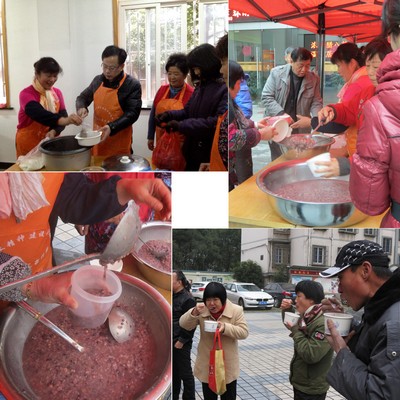 为了顺利地办好这个活动,社区干部们早早地就商量起了方案。一群热心的阿姨听说社区准备给居民送腊八粥,纷纷自告奋勇要求前来帮忙,方案很快定了下来。提前几天,阿姨们就采购了烧粥的各种材料以及一次性碗、调羹等器具,从自家或周围人家借来了大电饭煲、盛粥的大勺、大盆。一切准备停当,26日上午,大家就精神抖擞地开始了腊八粥的前期加工,各种不易煮开的豆类开始清洗浸泡,下午,豆豆们就开始被“请”进了锅。随着时间的流逝,香味逐渐弥漫了整个居民活动室,并沿着走廊一路飘到了大家的鼻子里,成功地引诱了吃货们的脚步。不过,这个时候还只能看不能吃。27日一大早,送腊八粥的日子正式到来,热情的阿姨们5点一过就赶来帮忙正式熬粥了,只见她们一个个分工明确,俨然训练有素的军人,有条不紊地进行一道道工序。七手八脚的同时,大伙嘴里也没闲着:“喝腊八粥好,喝了身体好!这个活动以前从来没弄过,今年社区能够想到为大家办这件受欢迎的大好事,真不容易!”