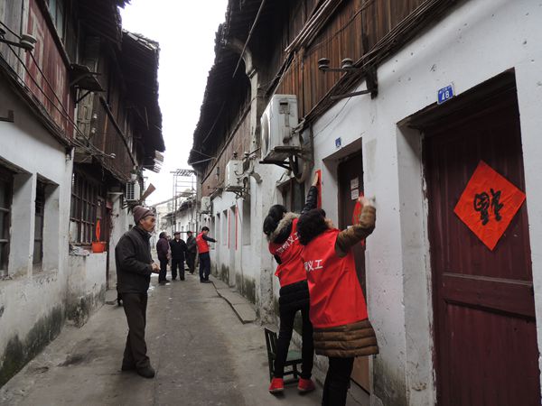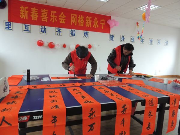 2月3日上午,社区第一网格的永宁老街:南门直街换上了新年的“盛装”。社区红色义工们为每家每户送“福”字、挂春联,永宁老街上洋溢着新春喜庆欢乐的气氛。此次活动社区第一网格联合社区计生协会、老年协会的书法爱好者为大家现场写春联、送福字,通过“墨字书法”向网格老街的居民送去羊年新春的祝福。