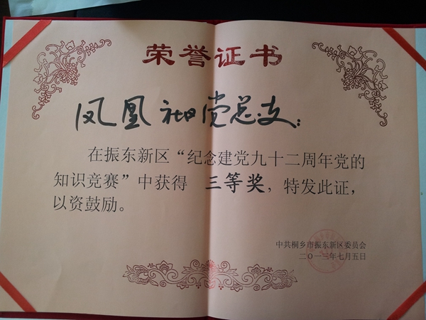 “纪念建党九十二周年党的知识竞赛”中荣获三等奖