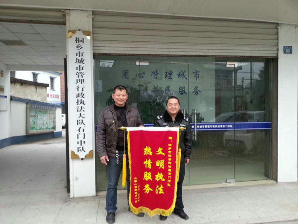 3月5日早,石门镇一个体经营者李先生来至市综合行政执法局石门中队将一面锦旗交到副队长余辉手上,展开锦旗,上面写着“文明执法、热情服务”八个大字。