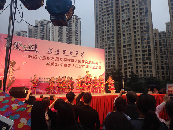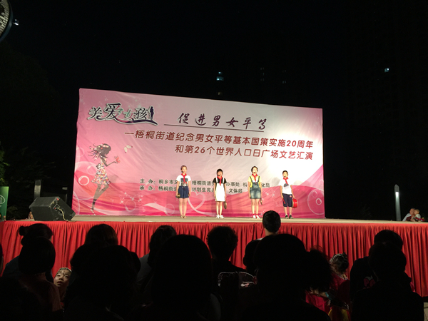 为了纪念男女平等基本国策实施20周年,迎接第26个世界人口日的到来,7月7日晚,梧桐街道妇联、计生办、文体站在市滨河广场联合举办了以“关爱女孩促进男女平等”为主题的广场文艺汇演,倡导全社会弘扬科学、文明、进步的婚育观念,吸引了300余群众驻足观看。