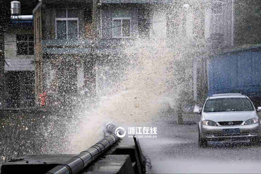7月10日下午2点,温岭城南镇。风助浪势,海浪打上城南镇吉捕岙村的防浪堤,溅起巨大的水花,足有二层楼高。