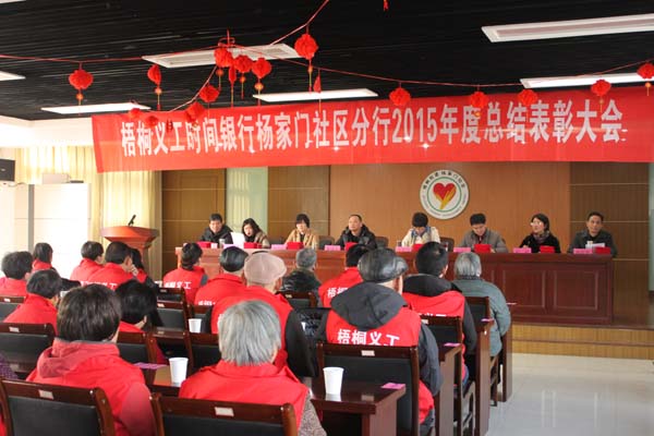 近日,梧桐义工时间银行杨家门社区分行2015年度总结表彰大会在社区三楼会议室召开,会议由社区党委副书记单园发主持,梧桐街道人大工委主任、社工委书记沈瑞芬,街道党委组织委员张绪江、党委宣传委员朱力佳、社管办主任陈雨出席,来自社区的各义工服务团队的义工代表参加了此次会议。
