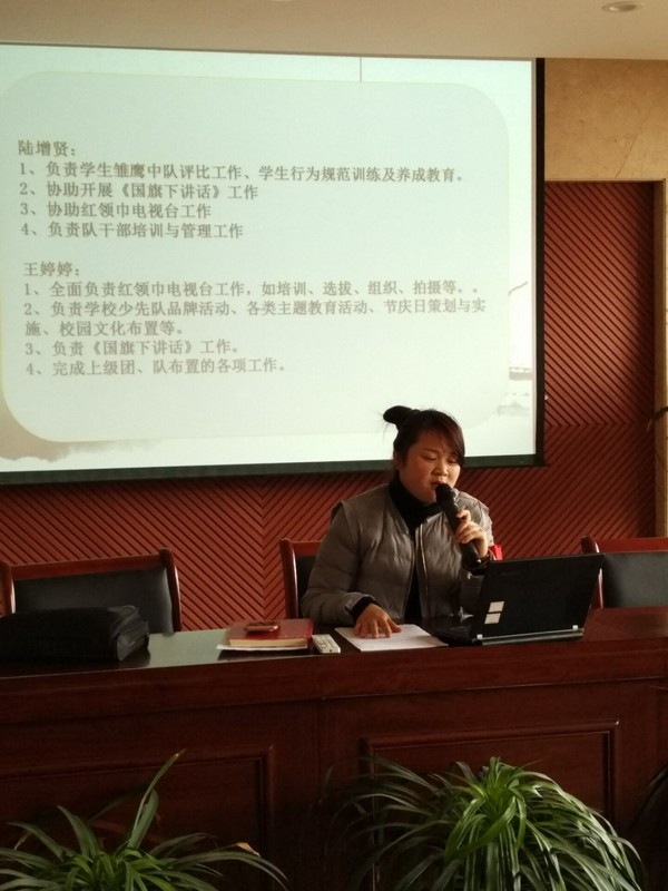 王晓娟首先向全体班主任介绍了学校德育线分工及大队辅导员的分工。翔云小学从上学期与原永乐校区合并后,经过一个学期的融合,各项事务皆已理顺,从本学期开始将打破原来的校区纵向格局,形成整体的横向格局,希望全体班主任加强年级交流,紧密联系。