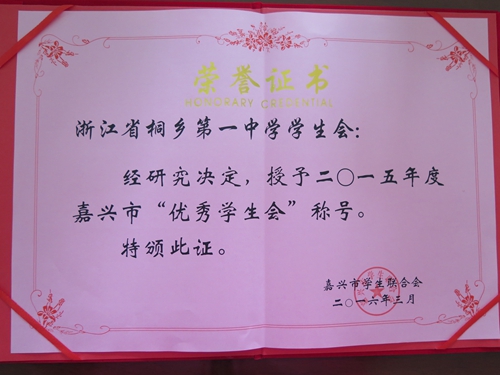 近日,桐乡第一中学被嘉兴市联合学生会评为2015年度嘉兴市“优秀学生会”称号。