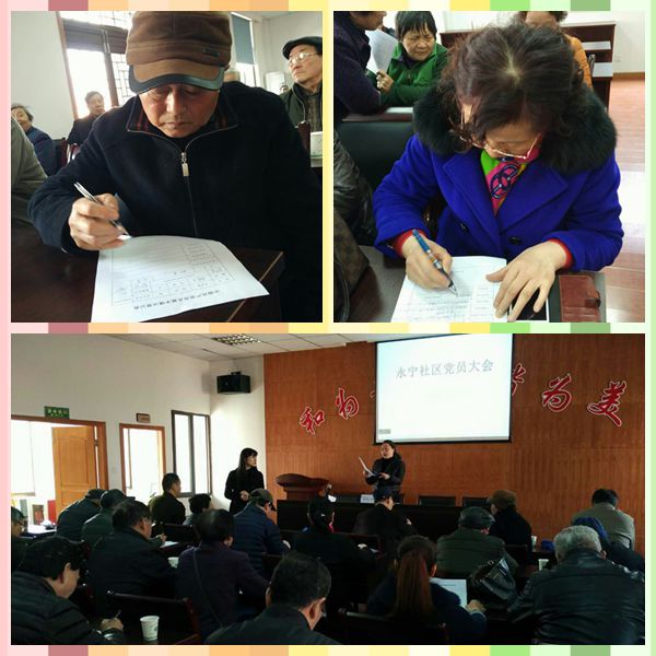 3月25日,永宁社区组织召开2016年度社区党员大会,社区党总支部班组成员、社区全体党员、全体社区工作人员参加会议,会议由社区党委副书记吴妍飞主持。