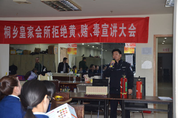 为浓郁“平安桐乡”氛围,扩大拒赌、禁毒等宣传教育覆盖面,推动平安工作向纵深发展,近日,凤凰社区联合振东派出所开展知识讲座,将最新的政策、法规知识送进辖区的重点单位——皇家会所。结合大型娱乐场所的行业实际,为皇家会所的服务人员、管理人员开展了“拒绝黄赌毒”的知识培训。