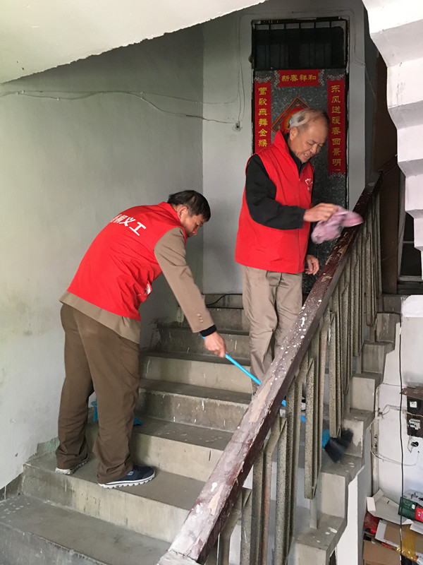 近日,九曲社区6位文明督查员在楼群内开展清扫楼道活动,他们中有些是老党员,有些是居民,但是他们都用无声地教育着身边的每个人。