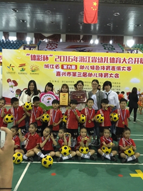 比赛中,孩子们个个精神抖擞,运用灵活的运球、跨球和踩球等技能,以球操的独特形式展现,吸引了评委的眼球、获得观众们阵阵热烈的掌声,展示了自己的体育运动特色,足球操最终在众多的特色体育项目中脱颖而出,荣获了浙江省特色体育表演二等奖和嘉兴市特色体育表演一等奖的好成绩。