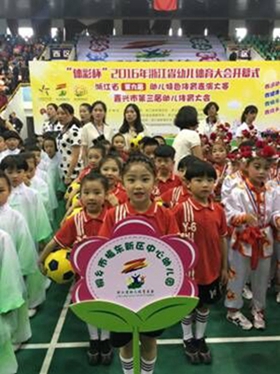 5月22日,浙江省第九届幼儿特色体育表演大赛在嘉兴市体育馆召开。桐乡市振东新区中心幼儿园由16位大班幼儿组成的一支强劲而有力的足球操表演队伍参加了此次活动。
