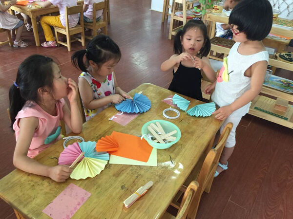 让孩子在美术这个艺术海洋中获得情趣,体验审美愉悦和创造的快乐!一张张彩纸、一根根棒冰棒,才一会儿工夫,一把色彩斑斓、形象生动的纸扇出现在孩子的手中。