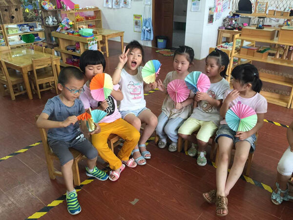 老师还特意为孩子们举办了一场“小小纸扇展”,孩子们高举自己的作品,特别自豪。此活动颠覆了以往用笔在纸上绘画的传统方式,孩子在折折、玩玩、说说中感受美,发现美、创造美。