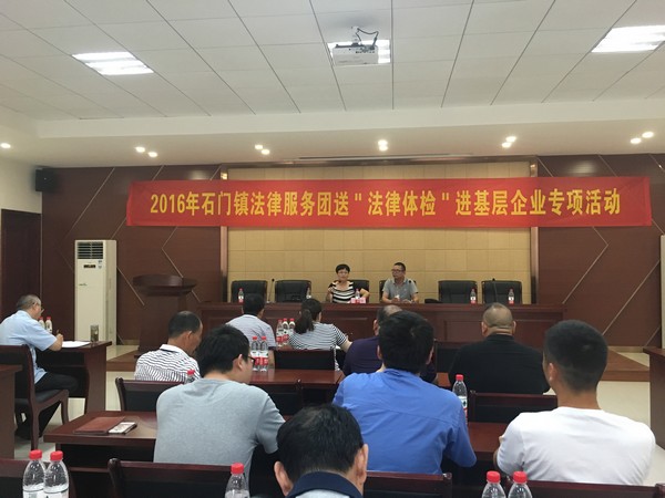 7月8日下午,石门镇普法办邀请了镇法律服务团的全体成员在浙江易锋机械有限公司开展“2016年度石门镇法律服务团送‘法律体检’进基层企业专项活动”,为辖区内企业“把脉开方”。石门镇辖区内40余家规上企业负责人参加了此次活动。