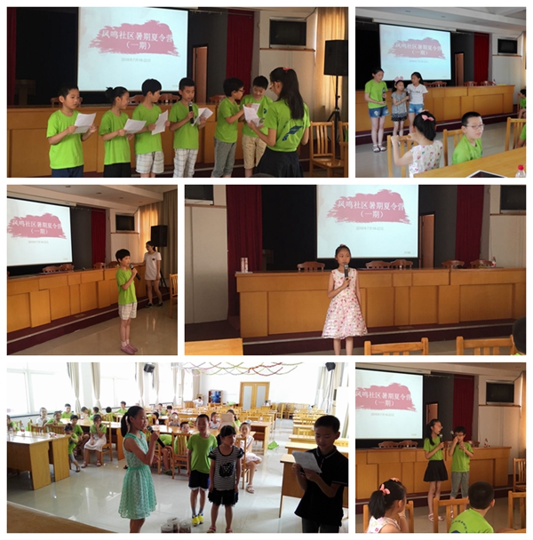 文艺汇演以一位小同学一道优美弧度的下腰开始。由于环境的不足,汇演中出现许多意外状况。比如三位女同学的清唱儿歌,没有伴奏,略微走调;再比如,讲笑话的同学自己先笑场了,而台下的同学却没笑;再再比如,一位小男生唱歌中途忘记歌词,好在有台下的观众唱歌提醒……但是小孩子活跃的天性并没有使舞台冷场。儿童的潜力是无穷的,而且略微的鼓励可以激发他们惊人的创造力。最后在大家的努力下,汇演圆满结束。一期的暑期夏令营虽然只有短短的五天,但是同学们在共同活动中,不仅开拓了眼界,丰富课内外知识,更培养了团队合作能力,交到了一群有爱的小伙伴们。