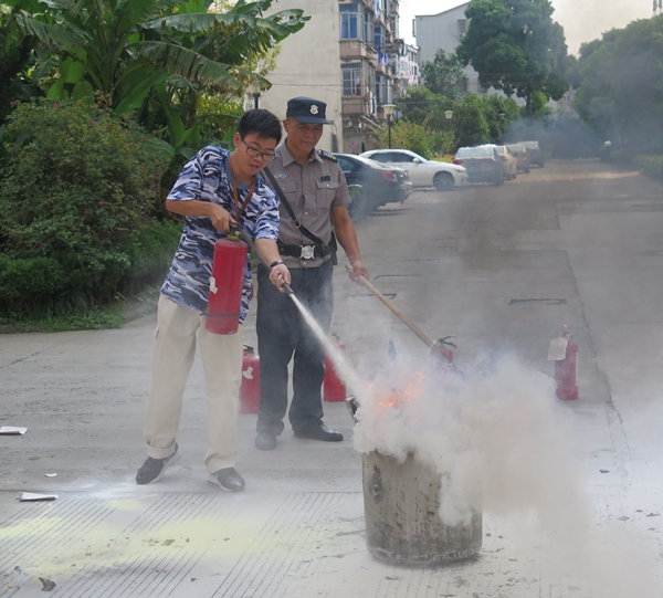 总务处在2号公寓和3号公寓楼下点燃柴火,公寓楼中拉响了火灾警报铃。同学们在班主任的指挥下用毛巾或衣服捂住口鼻,排队从楼梯依次向户外逃生,整个逃生过程紧张有序,没有发生推搡、拥挤和踩踏的现象。政教处副主任汪洋在演练结束后讲话,他希望全体学生高度重视逃生演练。只有平时重视,演练认真,才能在危险时刻保护自己的生命安全。随后,总务处组织学校保安、宿管阿姨和部分学生对燃烧着的柴火进行灭火器使用培训。总务处主任管红建提醒培训人员要牢记“一拔二摇三对准”,在上风口对准火焰根部进行灭火。保安、宿管阿姨和学生每人都进行了灭火操作,掌握灭火器的使用。下午,桐乡市消防大队黄邦杰为高一新生们做消防知识的相关讲座,介绍了灭火的方法、逃生时的注意事项及正确地逃生方法。