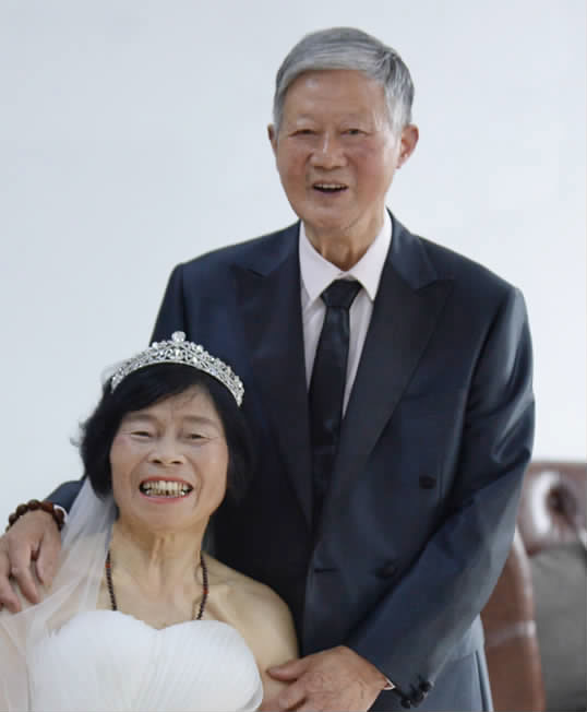 “再靠近一点”,在摄影师的催促下,周蕴玉大方地把头靠到老伴马玉林的肩膀上。80岁的周蕴玉性格活泼,拍完一组照片换场的间隙,她搀着马玉林说个不停,“今天是我第一次化妆,嘴巴会不会涂得太红……这个婚纱我穿着怎么样……”