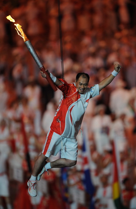 “虽然一开始我只是候选人之一,虽然几天前奥组委领导正式通知我这个任务交到我身上,但我想的最多的依然是如何完成好这个光荣的任务。我很平静,因为我知道,这不是我个人的事情,是我们国家、人民的梦想。就是在最后一刻,我也只想如何做好这些动作,而不会去想到其它。就像当运动员时,你如果老想到金牌,你上去肯定会失误。我每次比赛前只把动作在心里温习一遍,那你就会发挥出自己的水平。自当运动员以来,我一直就是这种保持平常心的心态。我这些天,甚至在梦里都在做最后的点火动作。”