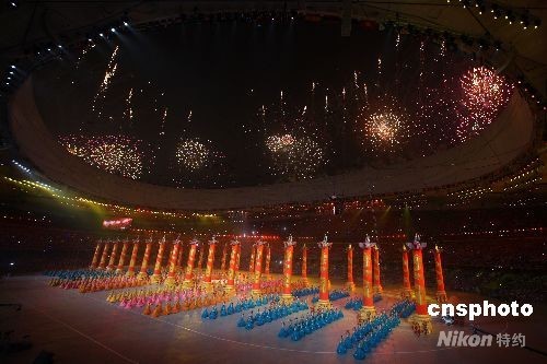 第二十九届夏季奥运会8月8日晚在北京奥林匹克公园内的国家体育场举行开幕式,礼花与中国礼乐表演构成恢弘场面。 中新社发 任晨鸣 摄