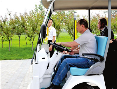 俄罗斯总理普京9日在北京奥运会奥运村里,自己驾驶电瓶车进行了参观,并在和平友谊墙上签下了名字。