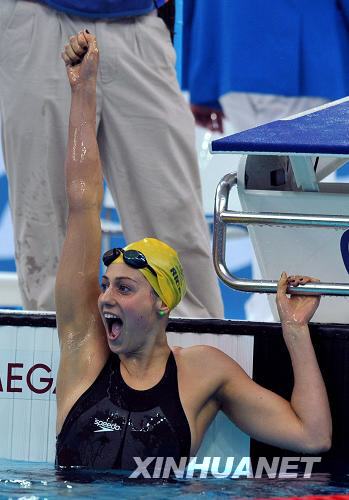 8月10日,澳大利亚选手赖斯庆祝胜利。当日,北京奥运会游泳比赛在国家游泳中心“水立方”继续进行,赖斯以4分29秒45的成绩创造新的女子400米个人混合泳世界纪录。新华社记者王定昶摄