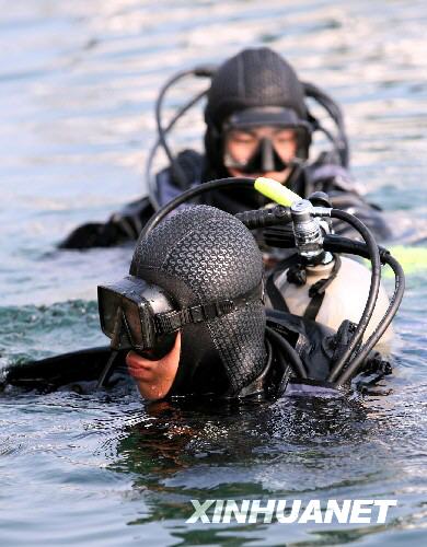 两位山东公安边防总队特勤大队的“蛙人”特警准备下水进行安全检查(5月14日摄)。新华社记者 范长国 摄