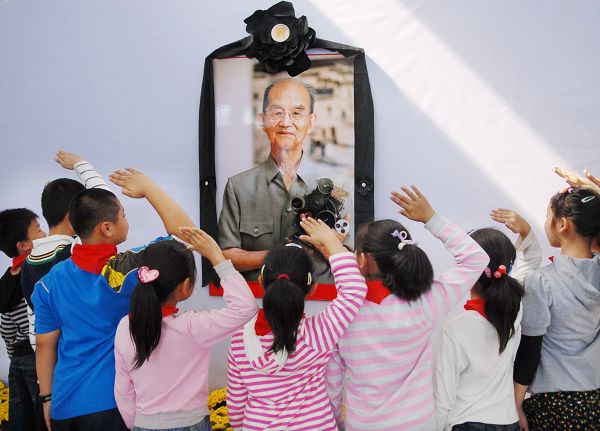 10时30分,桐乡市实验小学教育集团凤鸣小学的50多名师生也赶来了,孩子们在徐老的遗像前举起手,敬少先队员礼。孩子们的红领巾随风飘动,宛如多年前徐老来桐乡博物馆的那次,得知凤鸣小学就在附近,特意要求和孩子们合影。那一次,他戴上红领巾,被孩子们围在一起,笑得是那样灿烂。4年级4班的童家明也熟知徐老的故事,他说:“徐爷爷很勇敢,做事情锲而不舍,我们要向他学习!”