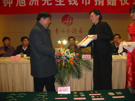桐乡市人民政府3月30日为钟旭洲先生隆重举行历代古钱币捐赠仪式。市委常委、宣传部长吴炳泉高度赞扬钟旭洲回报家乡、奉献社会,为家乡“文化之乡”建设作出了重大贡献。会上,副市长朱红和钟旭洲共同签署了《钟旭洲向桐乡市人民政府捐献历代古钱币桐乡市人民政府建造"钟旭洲钱币艺术博物馆"的协议书》。