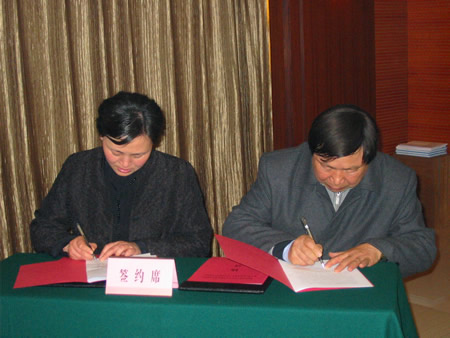 桐乡市副市长朱红(左)和钟旭洲(右)分别在协议书上签字。