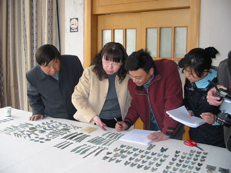 浙江省文物专家在为钟旭洲捐献的古钱币做文物等级鉴定。